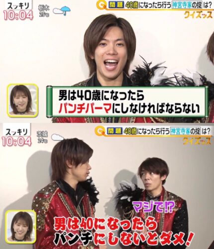 神宮寺は、「ずっとおじいちゃんが『男は40(歳)になったらパンチだ』と言ってきて」と話し、40歳になったらパンチパーマにしなければいけない掟があることを明かした。